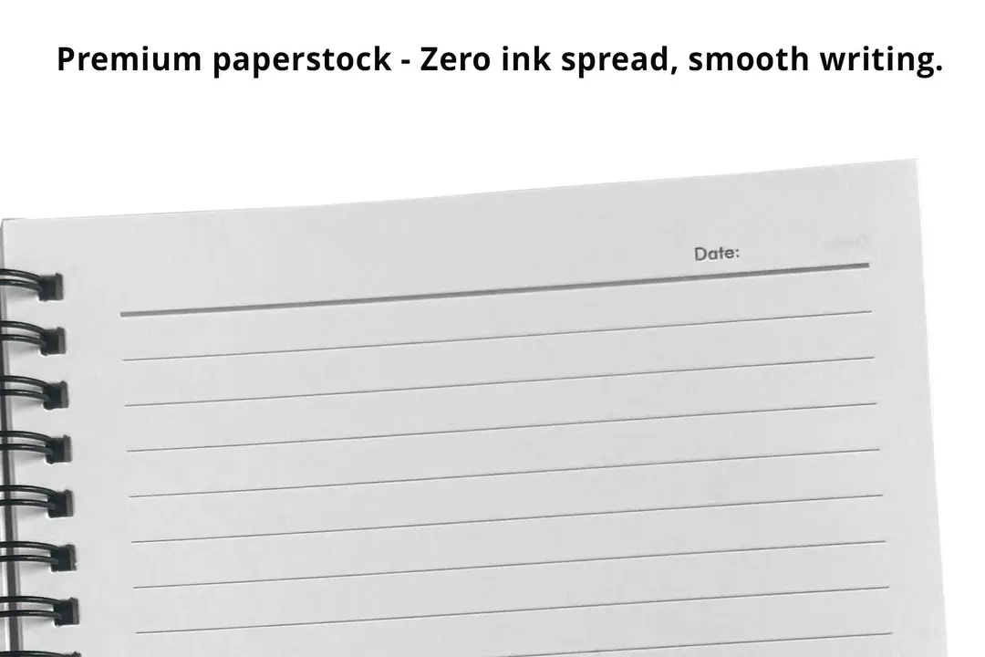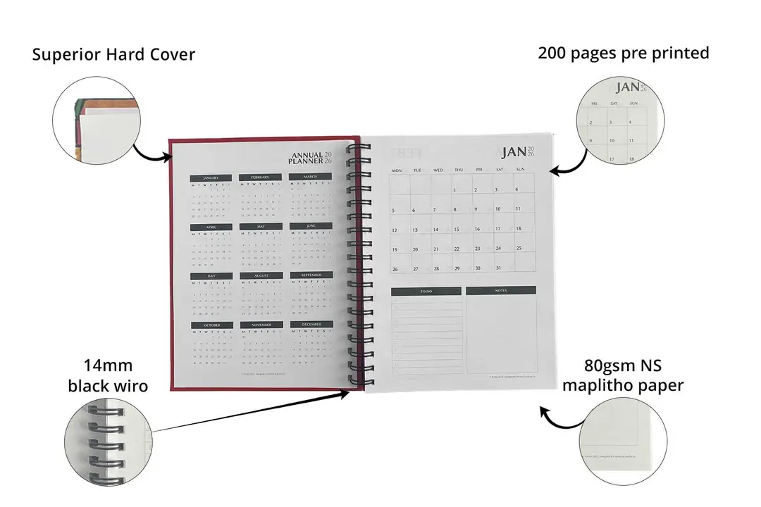 The diary is mounted on 1.5 mm cappa board with matte lamination, offering a sleek, professional look that lasts. B5 – 22 mm black wiro bindings allow smooth page-turning and a comfortable flat-lay design for effortless writing, combining style with functionality for daily use.